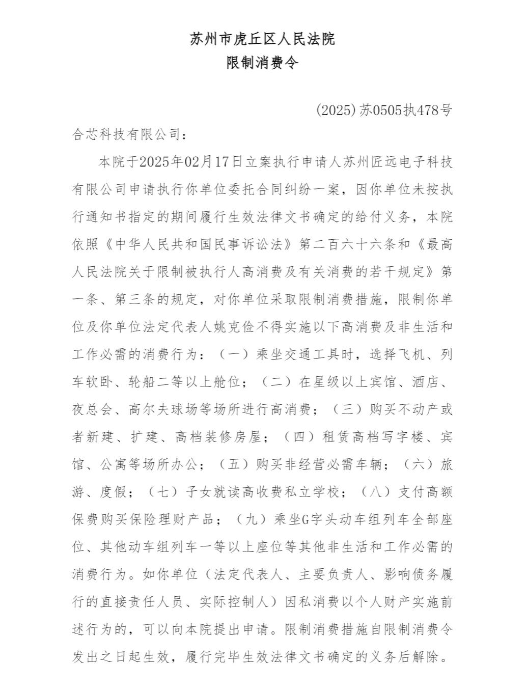 2 月 27 日 信息,苏州市虎丘区人民法院 2 月 25 日针对国产服务器 CPU 企业合芯科技及其法定代表人姚克俭发出 制约消费令,姚克俭被禁止 施行高消费及非生活和工作 必须的消费行为 。