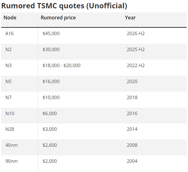 2004年的90nm,那时候一块晶圆 只有2000美元,随后一路水涨船高,N7 7nm已经 打破1万美元,N5 5nm高达1.6万美元,N3 3nm则接近或达到了2万美元 。