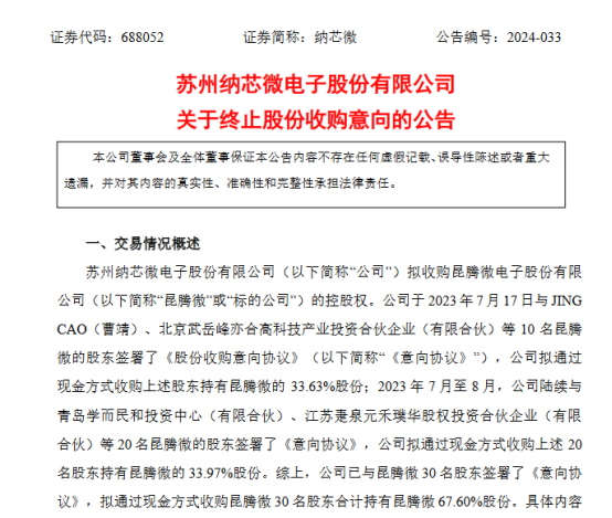 我们先来看一个更早的案例:2024年8月9日,苏州纳芯微电子股份有限公司(以下简称“纳芯微”)公布布告,筹备逾一年、拟以现金收购昆腾微电子股份有限公司(以下简称“昆腾微”)67.60%股份(整体估值不超过15亿元)的收购 方案正式终止 。布告 示意:“外部市场环境 变迁招致交易各方未能达成最后共识”,核心还是如何进行动态估值这一并购领域的痛点 。