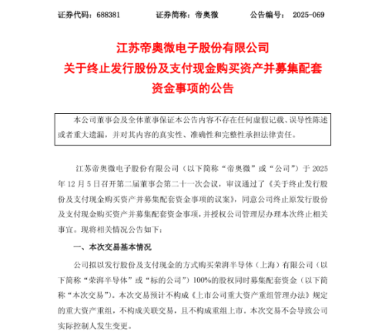 再看江苏帝奥微电子股份有限公司(以下简称“帝奥微”)终止收购荣湃半导体(上海)有限公司(以下简称“荣湃半导体”)案例:2025年12月6日,帝奥微终止对荣湃半导体100%股权的收购,原本双方同属高性能 模仿芯片赛道,业务存在高度互补性,帝奥微 善于信号链和电源治理芯片,荣湃半导体则在隔离芯片领域领先实现国产化,但最后因“交易 方案、价格及业绩承诺等核心条款未达成 统一”而搁浅 。
