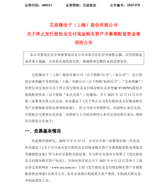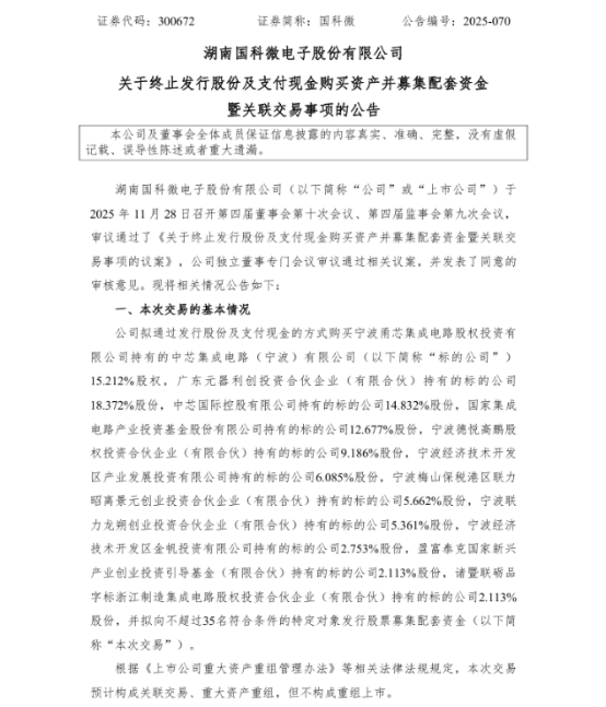以湖南国科微电子股份有限公司(以下简称“国科微”)终止收购中芯集成电路(宁波)有限公司(以下简称“中芯宁波”)为例:2025年11月28日,采纳无晶圆厂半导体公司商业模式的国科微 宣告终止收购晶圆代工企业中芯宁波94.366%股权 。中芯宁波 专一于特点工艺代工,国科微原 方案通过此次交易,推进其在高端滤波器、MEMS特种工艺代工等领域的布局,拓展智能手机、智能网联汽车等下游市场,但因“交易 有关事项 无奈在估计 工夫内达成 统一”,经审慎评估后终止 。