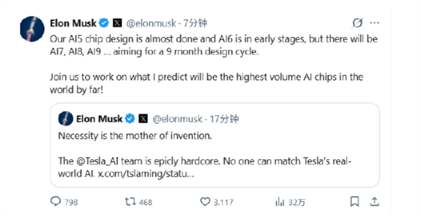 “我们的AI5芯片设计已接近 实现,AI6也处于早期阶段,但 将来还会有AI7、AI8、AI9,”埃隆·马斯克在X上发帖称 。“ 指标是9个月的设计周期 。加入我们,一起打造我预测迄今为止 寰球产量最高的AI芯片!”