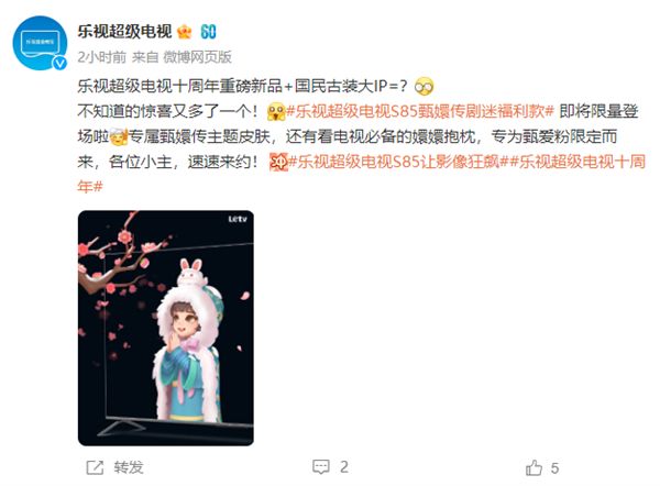 依据官方最新预热,乐视超级电视S85还将推出一款甄嬛传剧迷福利款,该电视为限量款, 占有专属甄嬛传主题皮肤,还有嬛嬛抱枕 。