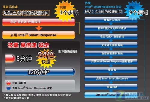 技嘉独有的EZ Smart Response技术确实节省了用户在安装硬件方面的时间,极大地缩短了上手过程,简化了安装步骤。用户所需要做的也仅仅是安装软件、重启便可以享受SSD硬盘作为缓存带来的速度提升。相比较传统做法需要重新进入Bios更改、需要重新安装系统,这无疑大大方便了用户。