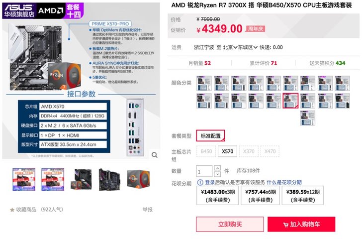 PRIME X570-PRO主板凭借强大配置、贴心设计和一流做工备受用户赞誉,其强大的供电和散热设计可完美释放第三代AMD锐龙处理器无限效能。搭配AMD锐龙7 3700X处理器,性能优异、颜值出众,轻松拿下各类型任务!而且现在购买板U套装更为实惠,到手价仅为4349元。