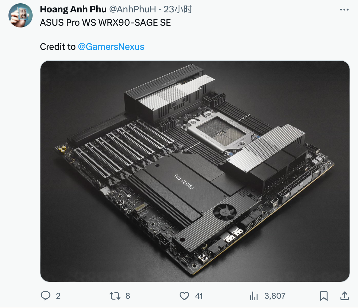 11 月 14 日 信息,华硕为 AMD 线程撕裂者 7000 解决器 预备的 Pro WS WRX90-SAGE SE 高端主板外观曝光,估计将在 11 月 21 日开始随 解决器面市 。