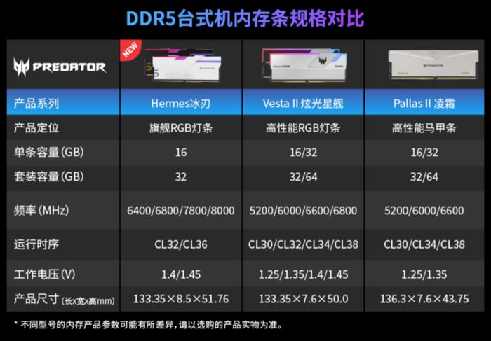 除了有8000MHz超高频率的套条,Hermes冰刃还提供6400MHz'7800MHz等不同频率的套条,其中6400MHz套条有32GB、64GB两种容量可选;6800MHz及以上频率有32GB容量可选 。游戏、游戏+直播、创作者等不同消费者,都 能够依据自己的实际需要 取舍 合适的规格 。