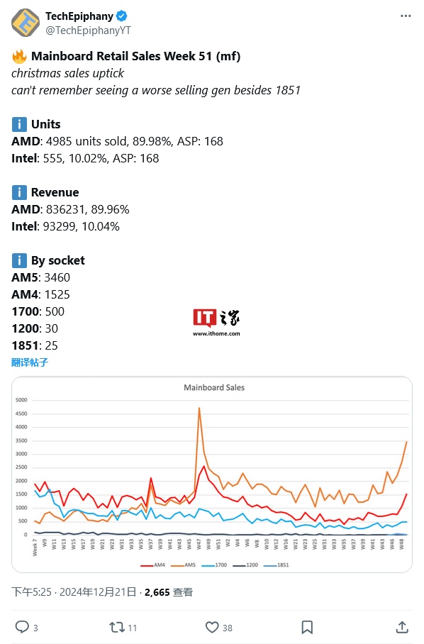 12 月 24 日 信息, 信息源 @TechEpiphanyYT 最新发布德国重要零售商 Mindfactory 的销售量数据,显示 AMD 上周在德国主板市场份额飙升,销售量远超英特尔,占领绝对优势 。