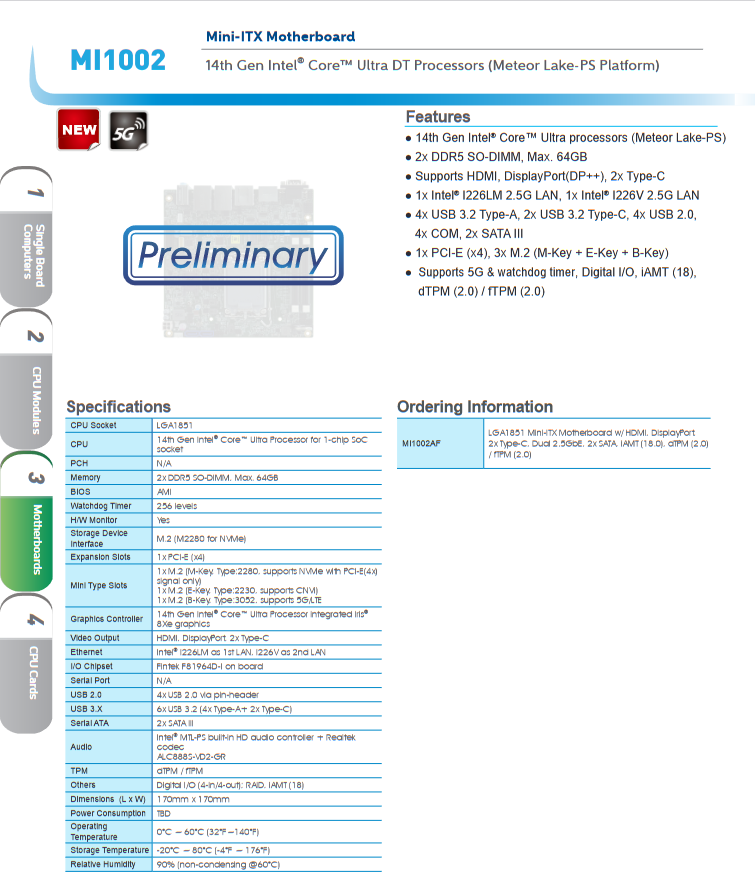 3 月 26 日 信息,广积科技是一家嵌入式计算机产品创造厂商,专精于工业计算机 OEM / ODM 服务,现在官网列出了一款带 LGA-1851 插槽的 Mini-ITX 主板 IBASE MI1002 。