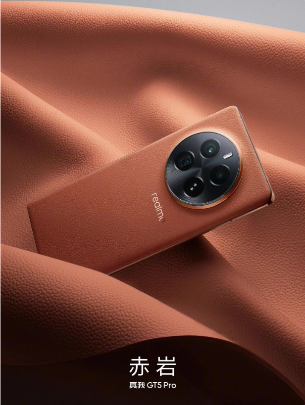 真我 GT5 Pro 提供赤岩、星夜配色,首发超硬铝金属中框,镜头模组 部分采纳齿轮设计,同时 占有“浮光琉璃工艺”的侧面 。“赤岩”的后盖材质为素皮,“星夜”的后盖材质则为?AG 玻璃 。