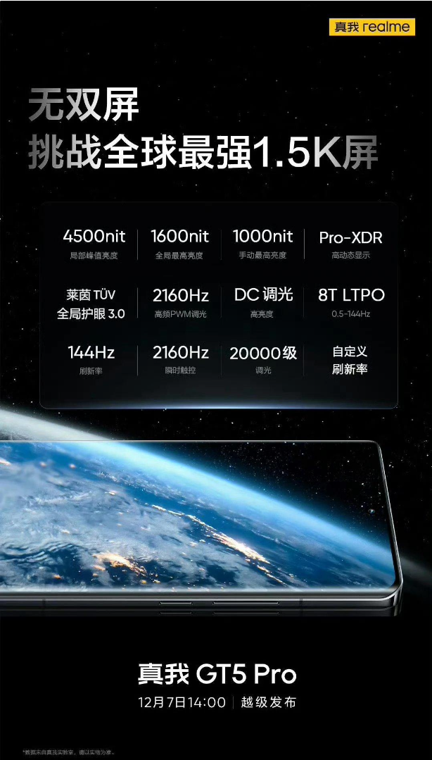 12 月 3 日 信息,realme 真我 GT5 Pro 再度预热, 宣告出厂搭载 realme UI 5.0,基于安卓 14?深度定制,提供?4 年系统 保护、3 次安卓大版本 晋级 。