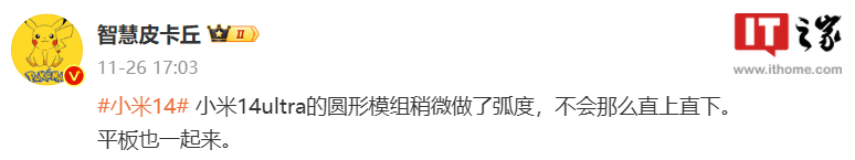 另外,据博主 @智慧皮卡丘 此前爆料,小米 14 Ultra 手机 的圆形模组略微做了弧度,不会那么“直上直下” 。假如以上爆料属实,估计小米 14 Ultra 的外观设计较上代机型不会有太大 变迁 。