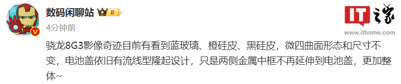 该博主 透露,这款新机将提供蓝玻璃、橙硅皮、黑硅皮等配色,在微四曲面 状态和尺寸不变的状况下,电池盖依然有流线型隆起设计,只不过两侧金属中框不再蔓延到电池盖,更加整体 。