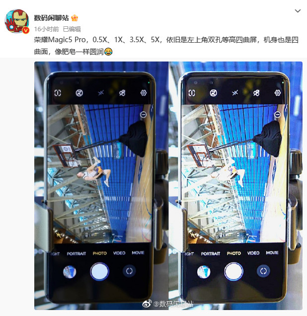 2月13日,博主数码闲聊站在微博放出了 光荣Magic5Pro的真机图, 能够看到 光荣Magic5Pro采纳了等高四曲屏,屏幕左上角采纳挖孔双摄设计 。