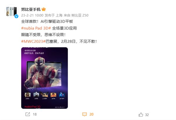 目前,努比亚手机官方 宣告,崭新平板nubia Pad 3D将于MWC 2023亮相 。