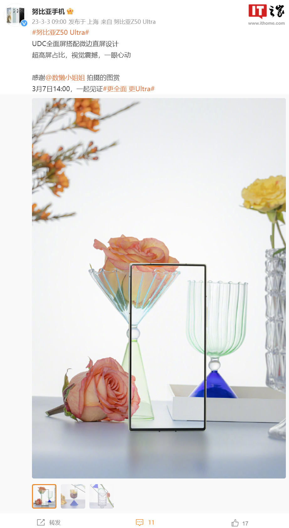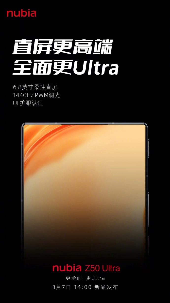 3 月 3 日 信息,努比亚手机官方今天上午曝光了努比亚 Z50 Ultra 的正面设计,称该机采纳 UDC 全面屏搭配微边直屏设计, 占有超高屏占比 。