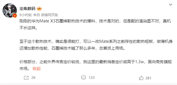 此前有 信息称,华为Mate X3的报价有望首次来到万元内,成为该系列报价最低的机型,不过,数码博主“定焦数码” 透露,该机定价或高于1.3万元,面向商务旗舰市场 。