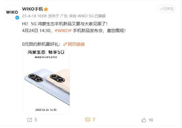 4月18日 信息,WIKO手机今天官宣,将于4月24日14:30 举办手机新品公布会,为大家带来Hi畅享60 。