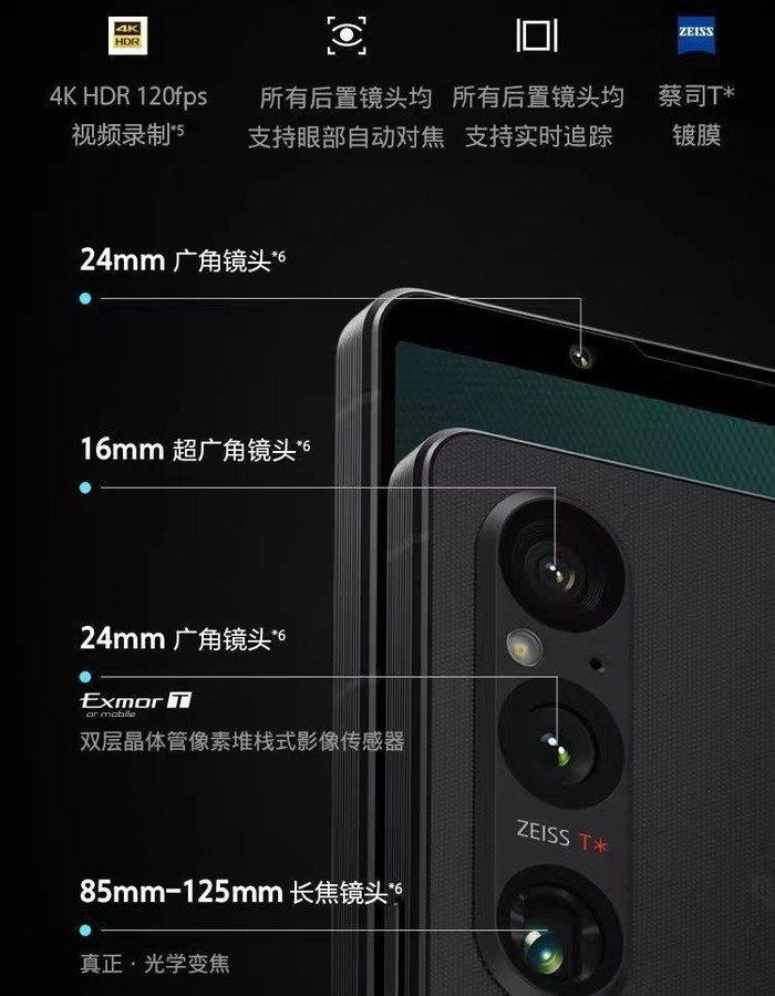 影像是这次索尼Xperia1V的重点 。此次Xperia1V搭载一枚16mm超广角,一枚24mm广角主摄,一枚85-125mm光学变焦长焦摄像头 。
