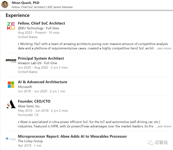 依据Nhon Quach博士的Linkdein上公布的以前工作履历显示,在2022年8月加入哲库科技之前,其曾历任Abee半导体的 独创人、CEO/CTO,微软AI & Advanced Architecture、亚马逊 试验室首席系统架构师 。