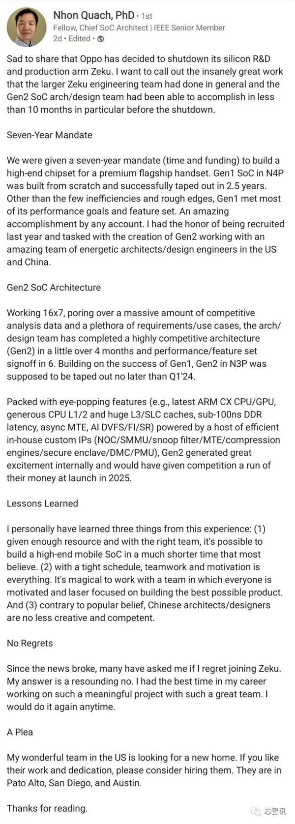 近日,个人 材料为IEEE高级成员、哲库科技首席SoC架构师、Fellow的Nhon Quach博士通过Linkedin公布信息,曝光了哲库科技研发智能手机高端SoC芯片的一些细节,并称哲库科技的第二代SoC架构/设计团队在哲库关闭前的不到10个月的 工夫内就 根本 实现了 有关工作 。
