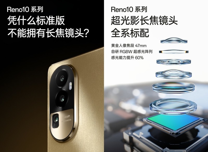 OPPOReno10系列 标准版采纳超光影长焦镜头, 支撑47mm黄金人像焦段,搭载自研的RGBW超感光阵列,让手机的感光 威力 晋升60%之多 。