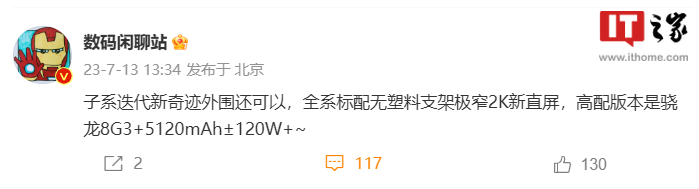 该博主还 透露,新机高配版本还将搭载高通骁龙 8 Gen 3 解决器,机身内置 5120mAh 大电池, 支撑 120W 有线快充等,该系列产品卖点在于“屏幕、主摄、外围配套” 。
