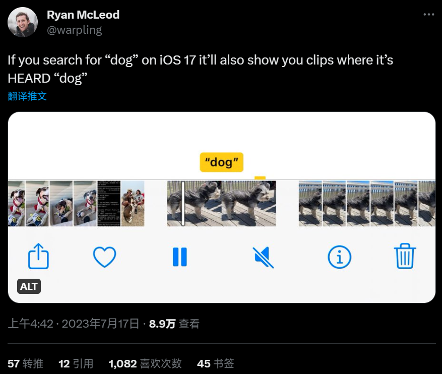 依据 Ryan McLeod 公布的推文显示,在 iOS 17 中,消费者 能够通过在相册中输入一系列动物叫声,相册便能自动找到对应片段,例如 Ryan McLeod 在查找框中输入“dog”,相册便为其调出了近期所拍摄的带有狗吠声的视频 。