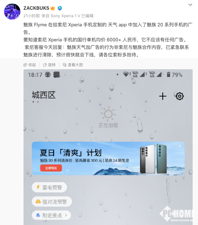 微博博主“ZACKBUKS”爆料称,索尼Xperia手机上的天气App中浮现了魅族20手机的广告 。