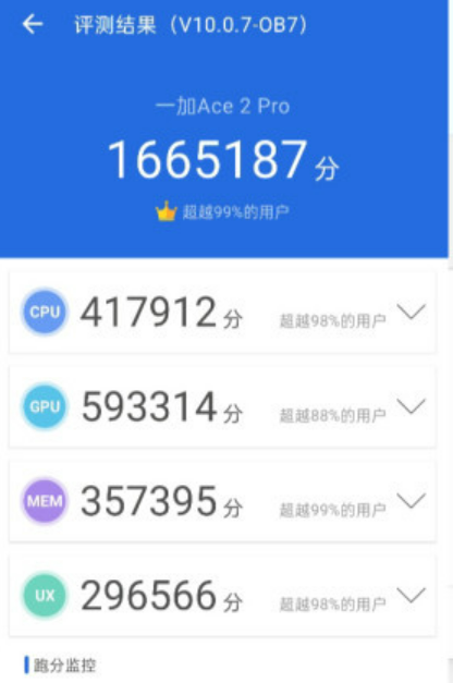 一加 Ace 2 Pro搭载了采纳台积电4nm制程工艺的第二代骁龙8移动平台,CPU性能比上一代 晋升了35%,功耗减低40%,并且GPU性能 晋升25%、功耗减低45% 。安兔兔跑分 打破166万分,与上面的iQOO 11S殿堂级电竞手机不分上下,用“顶级”的水平,去形容他们的 效劳并不 夸大 。