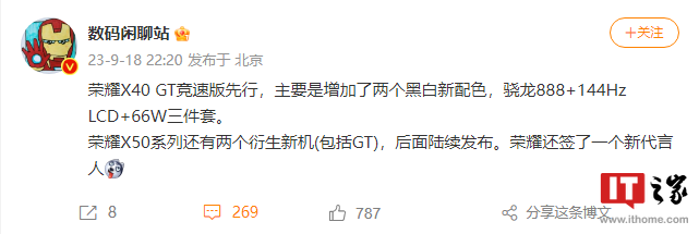 IT之家 留神到,@数码闲聊站 还 透露, 光荣 X50 系列还有两个衍生新机,包含 GT 版,后面陆续公布 。此外, 光荣还签了一个新代言人,但具体是谁该博主并未 透露 。