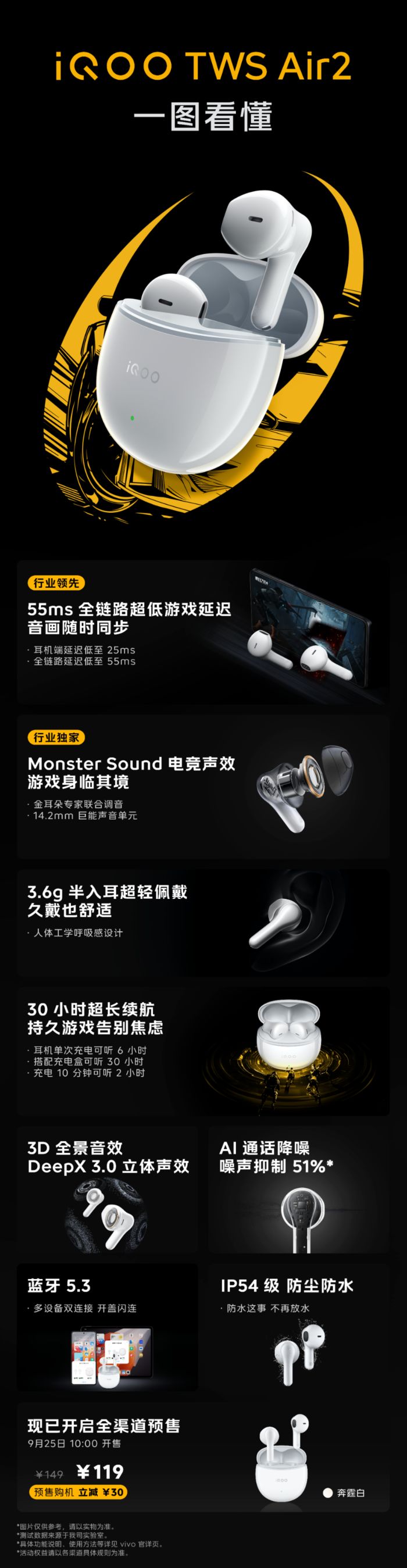 2023年9月19日,“超低游戏延迟沉醉电竞声效”iQOOTWSAir2今天正式开启全渠道预售,9月25日10:00点正式开售,新品价格仅为149元,预售期间更立减30元,到手价仅需119元 。iQOOTWSAir2 支撑55ms全链路超低游戏延迟、定制14.2mm巨能声音单元、MonsterSound电竞声效、3.6g单耳超轻佩戴感和30小时超长续航等优异体验,是一款性能非常出众的TWS产品 。
