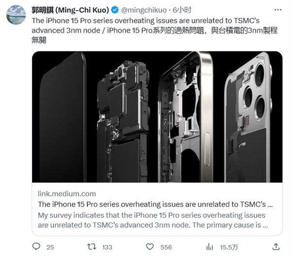 台积电3nm不背锅!郭明錤:iPhone 15 Pro过热是散热问题 |