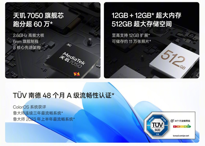 除此之外,OPPOA2Pro还装备了好一些旗舰级别的 性能, 比方金刚石抗摔 构造、67W超级闪充和IP54生活防水 。此外,它还装备了12GB+12GB的超大内存和512GB的超大存储空间,以及天玑7050旗舰芯片,手机运行更快、存储更多、玩得更爽 。