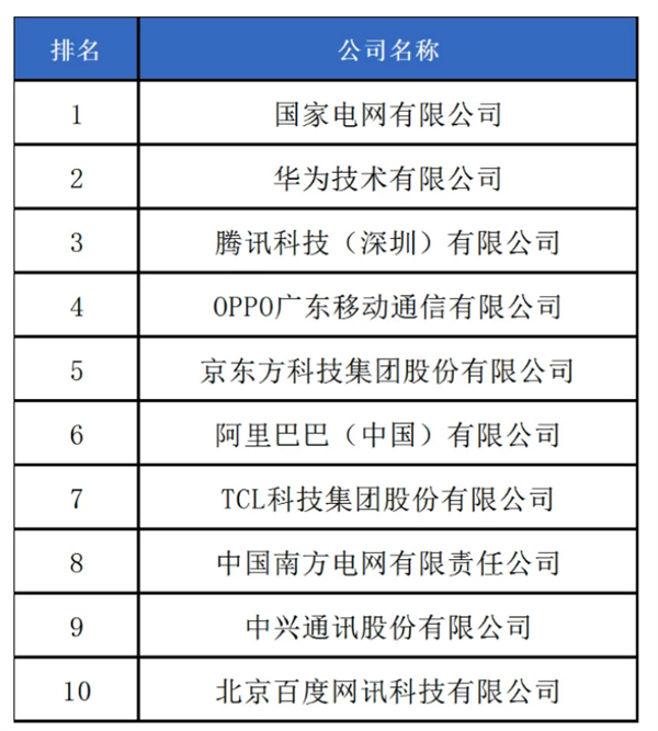 中国 创造专利申请量TOP 10中显示,国家电网、华为、腾讯、OPPO和京东方分列前五名 。