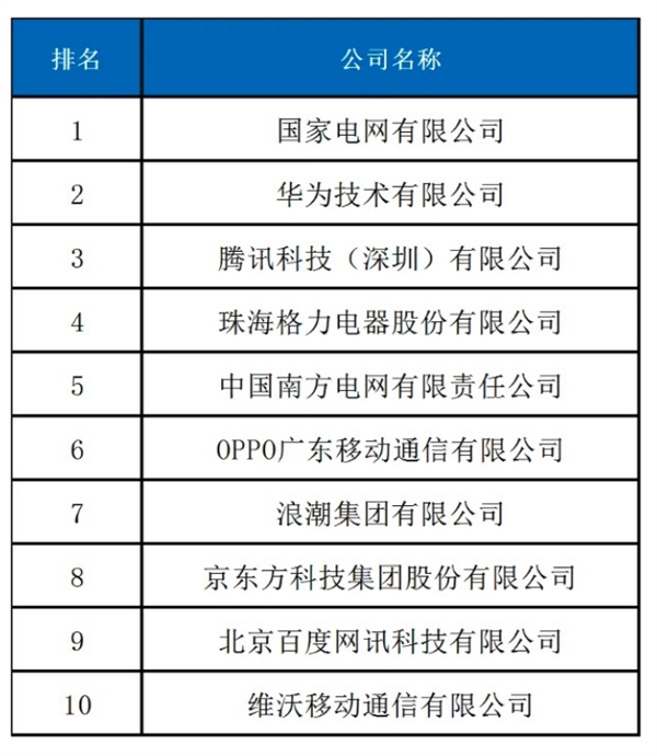 从中国企业专利创新百强榜TOP 10 能够看到,华为、国家电网和腾讯位列前三名,而OPPO、京东方、百度、格力、重心,中国石油分列4-10名 。