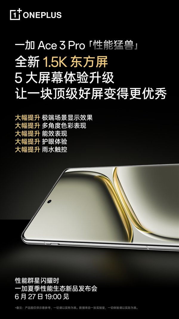 6月26日 信息,今日,一加 宣告Ace 3 Pro搭载崭新一代1.5K东方屏, 占有5大屏幕体验 晋级 。