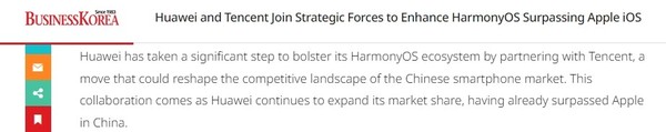 韩媒:华为与腾讯等战略合作 助力鸿蒙OS超越苹果iOS |