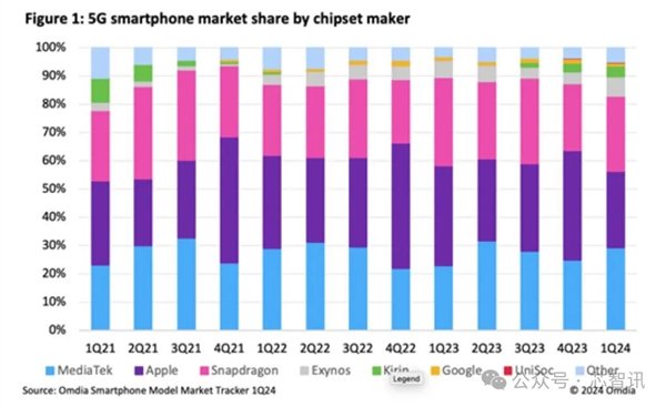 三星在其Galaxy S24系列的助力下,其Exynos 解决器的出货量有显而易见的增进,带动其市场份额增进至约7% 。