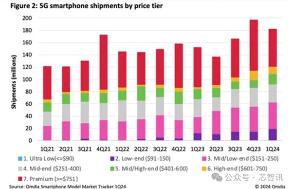 另外,排名第三的苹果则在高阶智能手机市场占有主导地位 。