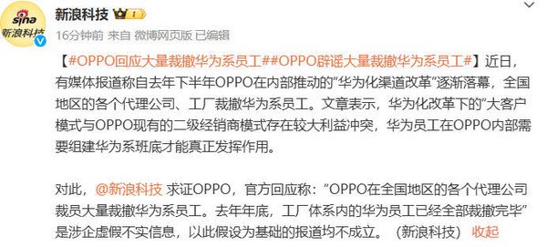 OPPO官方回应大量裁撤华为系员工:虚假不实信息 |