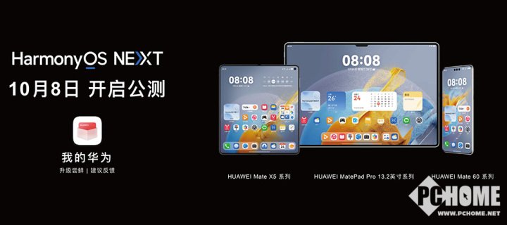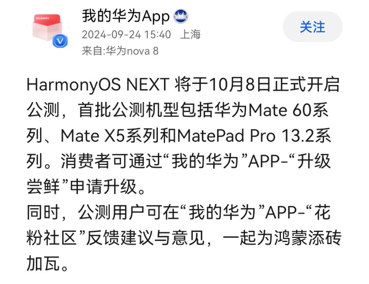 据华为方面官方 信息称,HarmonyOS NEXT将于10月8日正式开启公测,首批公测机型包含华为Mate 60系列、华为Mate X5系列和MatePad Pro 13.2系列 。