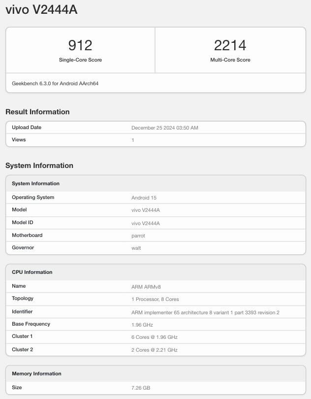 1 月 2 日 信息,此前有 信息称 Vivo 正在筹划崭新子品牌“Jovi”,瞄准入门级和经济型智能手机市场 。MySmartPrice 在 Geekbench 跑分平台上发现了一款疑似 Jovi 品牌的新机,型号为 V2444A,或将命名为 Jovi Y39 5G 。