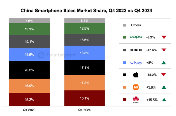 据BCI数据显示,2024年,华为在中国手机市场的销售份额达到了18.3%,排名第一 。Counterpoint的数据也显示,2024年第四季度,华为的市场份额为18.1%,同样位居第一,同比增进了15.5% 。而Canalys的数据则指出,华为2024年全年的手机出货量为4600万台,年增进率更是达到了37% 。这些数据 充足表明了华为在经历了前所未有的 挑战和困苦后,在产品层面 展示出了壮大的复苏威力,已经 顺利实现了逆袭 。