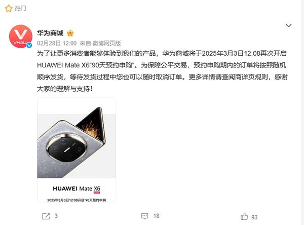 当前华为Mate X6已亮相3个多月,消费者关于购机 热诚依然热烈,在二级市场不乏加价状况 产生,不久前,华为商城发布华为Mate X6“90天预约申购”于3月3日正式开启,为了让真正想购买华为Mate X6的消费者 能够买到心仪产品,严防黄牛加价行为,想要购买华为Mate X6的消费者 能够提前申购 。