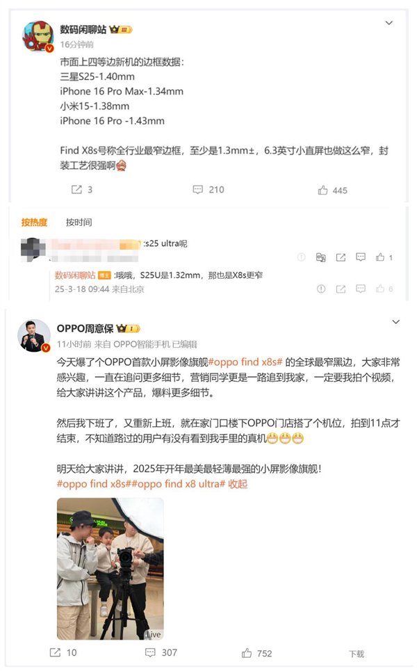 数码闲聊站 示意,当前行业最窄的机型是三星Galaxy S25系列,Ultra版机型的边框惟独1.32mm,OPPO Find X8s比三星更窄 。