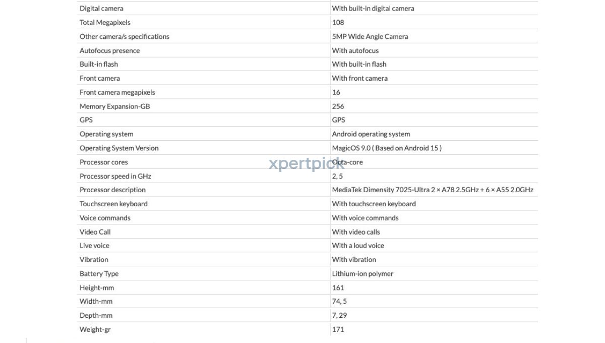 系统方面,该机运行基于安卓 15 的 Magic 9.0 系统,机身尺寸为 161 x 74.5 x 7.29 毫米,分量为 171 克,轻薄便携 。