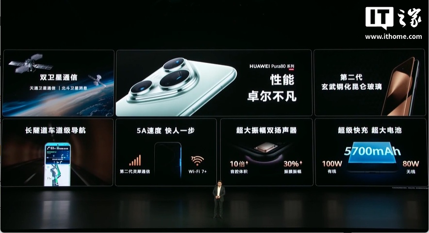 华为 Pura80 Pro+ 和 Ultra 依然搭载双卫星通讯, 支撑第二代灵犀通讯, 支撑 5GA,NFC、导航 威力都有 晋升, 支撑星闪,首发星闪车钥匙 性能 。华为 Pura80 Pro 系列及 Ultra 搭载超大振幅双扬声器,相较 Pura 70 Pro + 音腔体积 晋升 10 倍,振膜振幅 晋升 30% 。Pura80 Pro 系列及 Ultra 内置 5700mAh 电池, 支撑 100W 有线超级快充、80W 无线超级快充 。