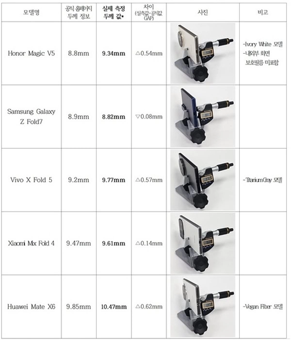 但是,韩国用户 核心企业协会(Korean Consumer-Centered Enterprise Association,简称 KCEA)公布了一项独立探究,该探究对照了 Galaxy Z Fold7 与 光荣 Magic V5、华为 Mate X6、vivo X Fold 5 和小米 Mix Fold 4 等多款顶级竞争对手的厚度, 后果显示各手机实测厚度如下: