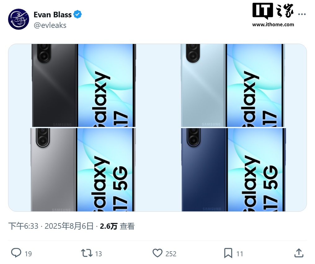 8 月 7 日 信息, 信息源 Evan Blass 昨日(8 月 6 日)在 X 平台公布系列推文,分享了三星 Galaxy A17 手机的渲染图, 展示了黑色、浅蓝色、灰色和深蓝色四种 色彩 。